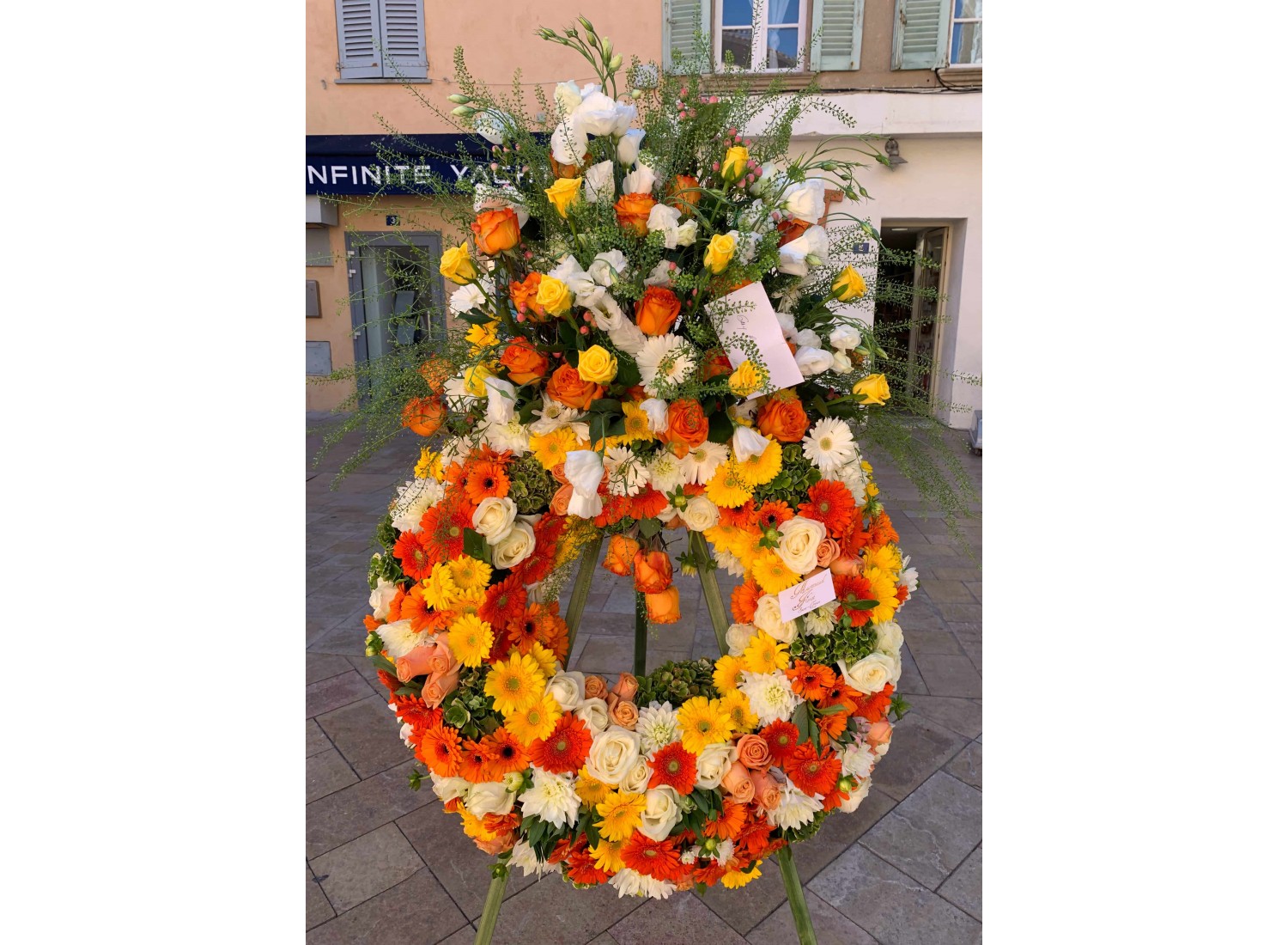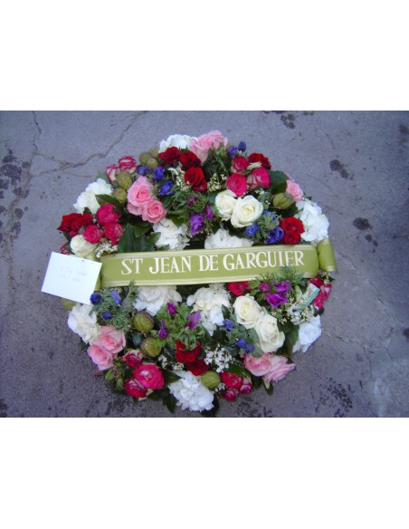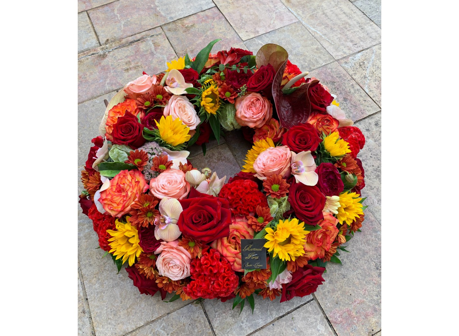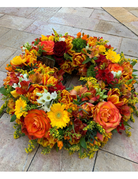 Die Größe des Kranzes variiert je nach Budget und verwendeten Pflanzen. Zum Beispiel: Ein Kranz mit einem Durchmesser von 50 cm und einer Mischung aus Blumen (Hortensie, Rose, Lilie, Germinis und andere Blumen) kostet 200 €.