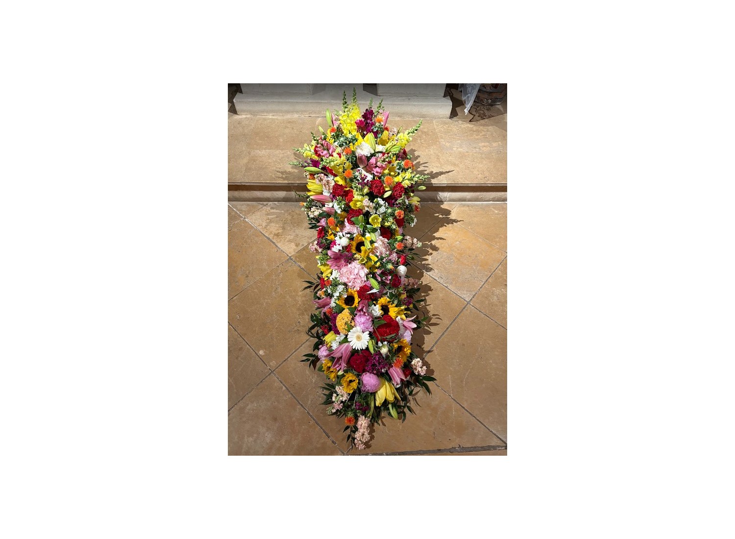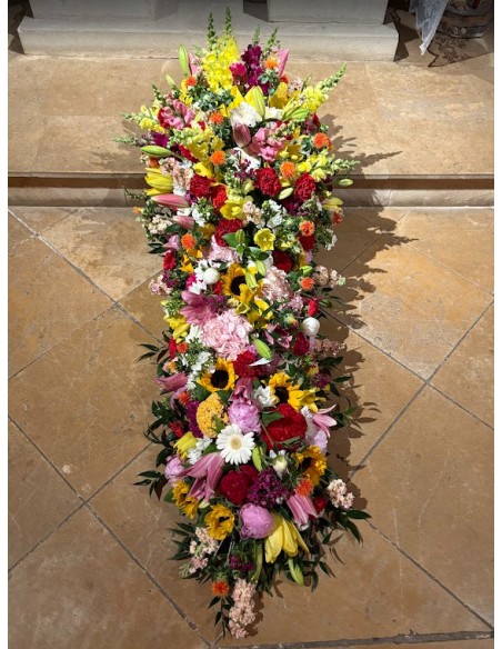 The colorful casket top is a quilted floral arrangement on a hydrated foam backing, which is cut to size for your budget. It will be made with flowers in the selected tones.