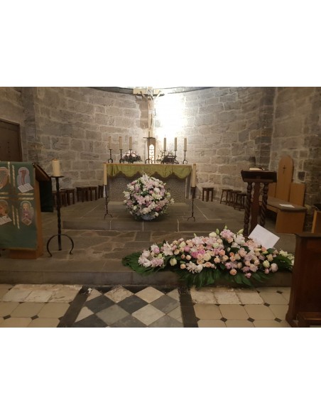 This pastel arrangement is an elongated composition. It will be made with flowers in pink, white and green tones.