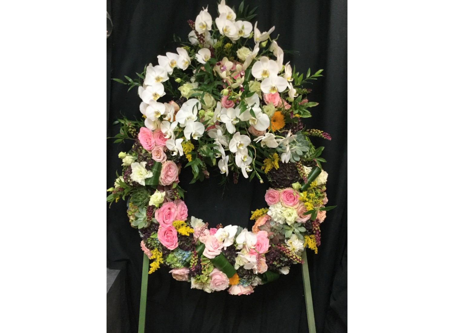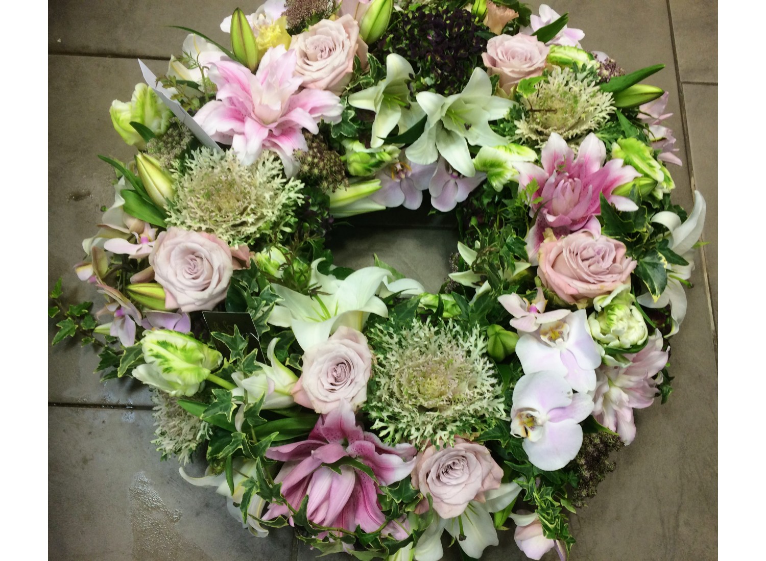 The funeral wreath is presented flat, it will be made in pink, white and green tones.