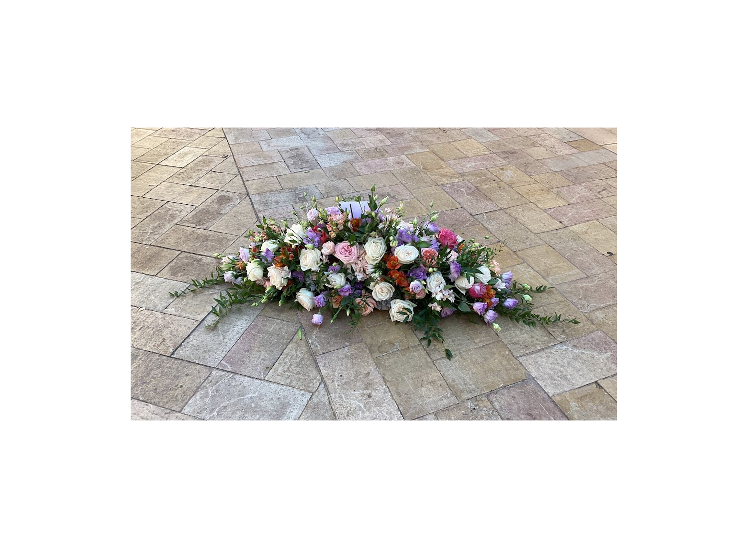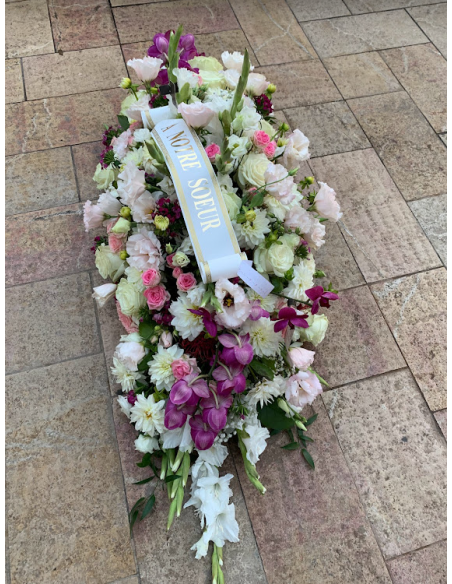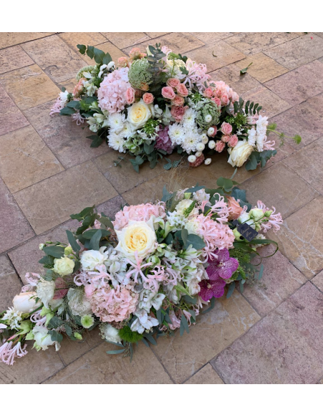 La raquette pastel est une composition de forme allongé. Elle sera réalisée avec des fleurs dans les tons rose, blanc et vert.